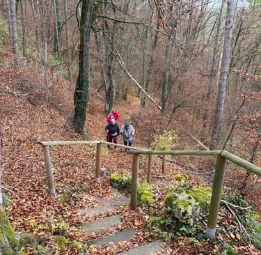 Bei Herbstwetter starteten wir unsere Wanderung am Hotel Fürstenhof. Vorbei am historischen Fürstensaal und Kurmittelhaus führte uns der Weg an der ersten Hinweistafel rechts hinauf zur Schutzhütte im Gewann „Gurgel“. An der Albliege bot sich uns ein herrlicher Blick über das Eyach- und Laibetal.