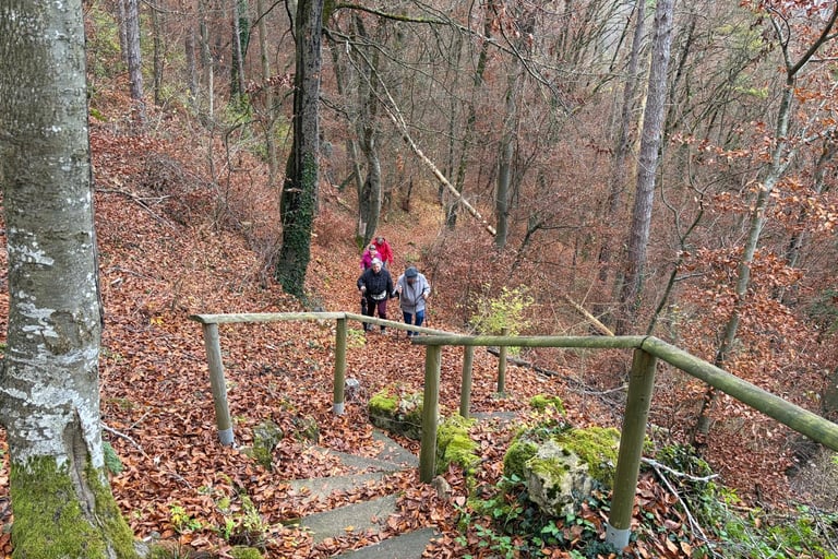 Der Pfad verlief weiter am Südhang entlang, immer wieder mit schönen Ausblicken auf Bad Imnau. Ein kurzer Halt galt dem Gedenkstein an der „alten Steige“, der an den Waldschützen Xaver Kotz erinnert. Über den Grillplatz ging es weiter durch dichter werdenden Wald zur Madonna-Statue im Gewann „Hauchen“. Die 1957 gestiftete und 2015 restaurierte Figur lädt mit zwei Ruhebänken zum Verweilen ein.